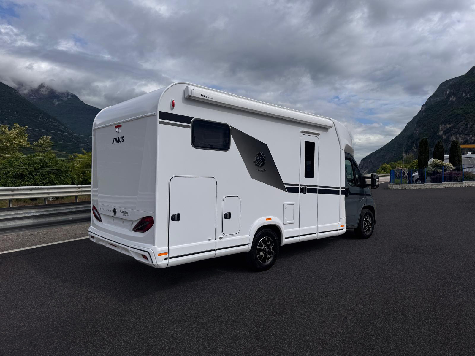 Porta d’ingresso KNAUS PREMIUM: con sistema di chiusura tipo automobilistico, in un unico pezzo, con doppia guarnizione, sistema di chiusura multipla, cerniere a scomparsa, limitatore di apertura/fermaporta mediante pistone a gas, inclusa finestra con tenda plissettata, vano porta ombrelli integrato, applicazioni decorative pregiate, borsa multiuso nel design KNAUS
