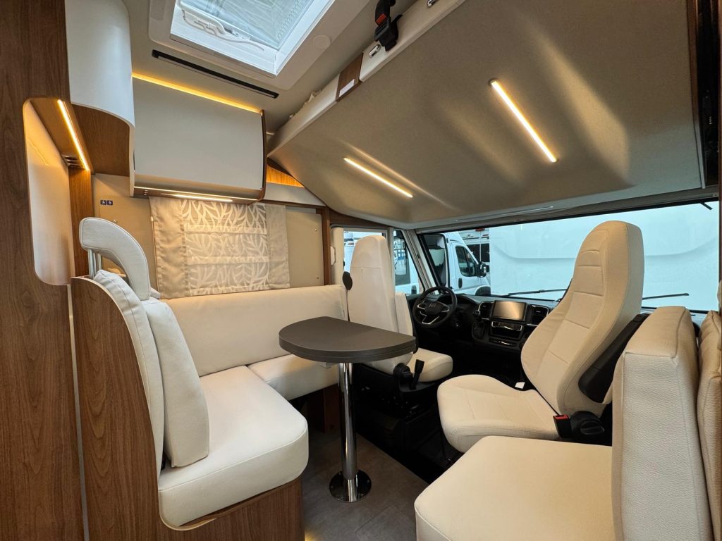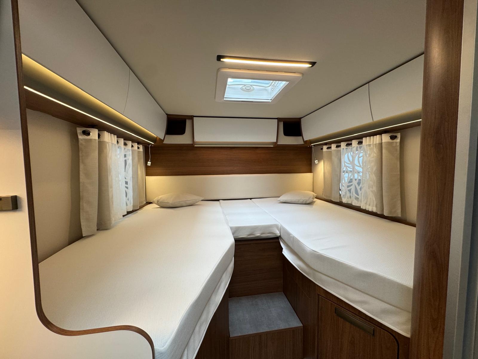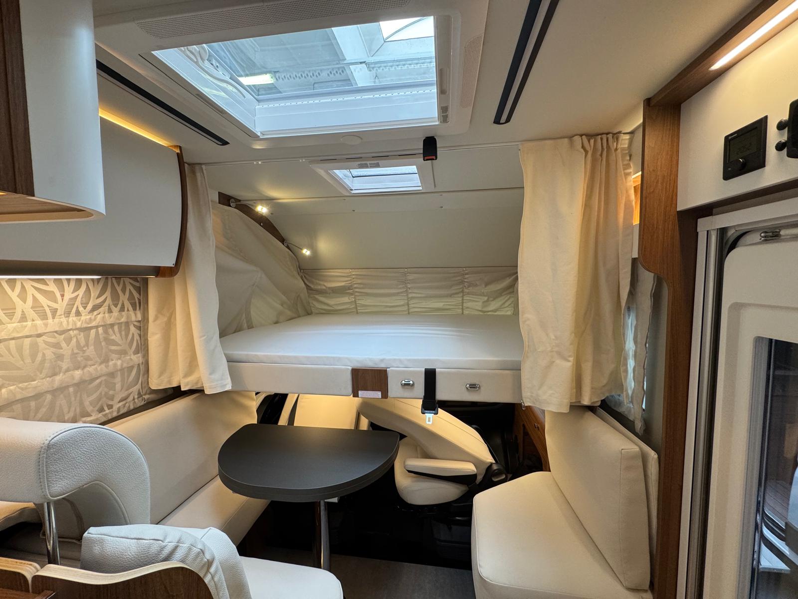 Letto basculante completamente integrato nella linea dei pensili, completo di rete a doghe, materasso di alta qualità, tenda perimetrale di cortesia, luci di lettura orientabili, prese USB, oblò a tetto, vano di stivaggio dedicato, riscaldamento