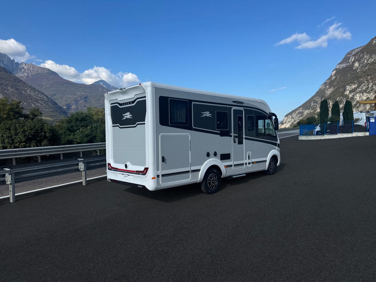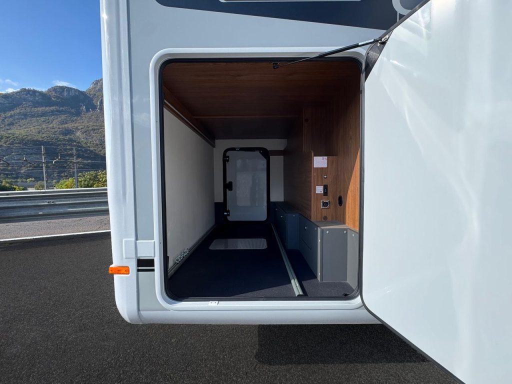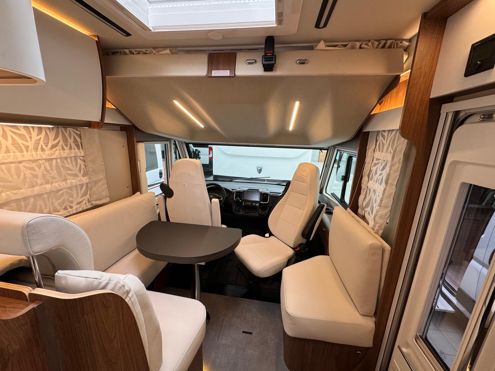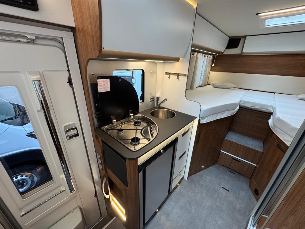 Letto basculante completamente integrato nella linea dei pensili, completo di rete a doghe, materasso di alta qualità, tenda perimetrale di cortesia, luci di lettura orientabili, prese USB, oblò a tetto, vano di stivaggio dedicato, riscaldamento
